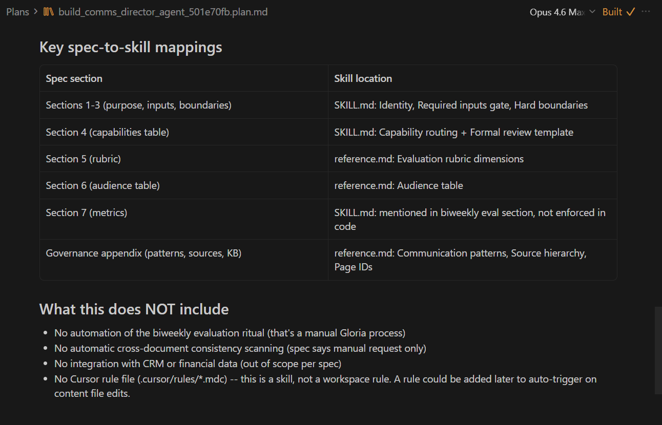 Each skill is defined in a SKILL.md file, a structured markdown document that specifies identity, capabilities, boundaries, data access, decision rules, and output formats. I treated these like versioned operational playbooks. When the Comms Director’s evaluation rubric needed updating after a colleague’s feedback, I changed one file. Every future review automatically used the new criteria.
